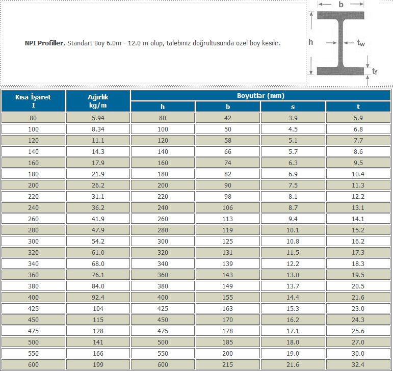 NPU demir, NPI demir, ağırlık tablosu, Çelik Çekme Boru, Siyah Dikişli, Spiral Sarımlı, NPU, NPI, IPE, HEA, Profil, HEB